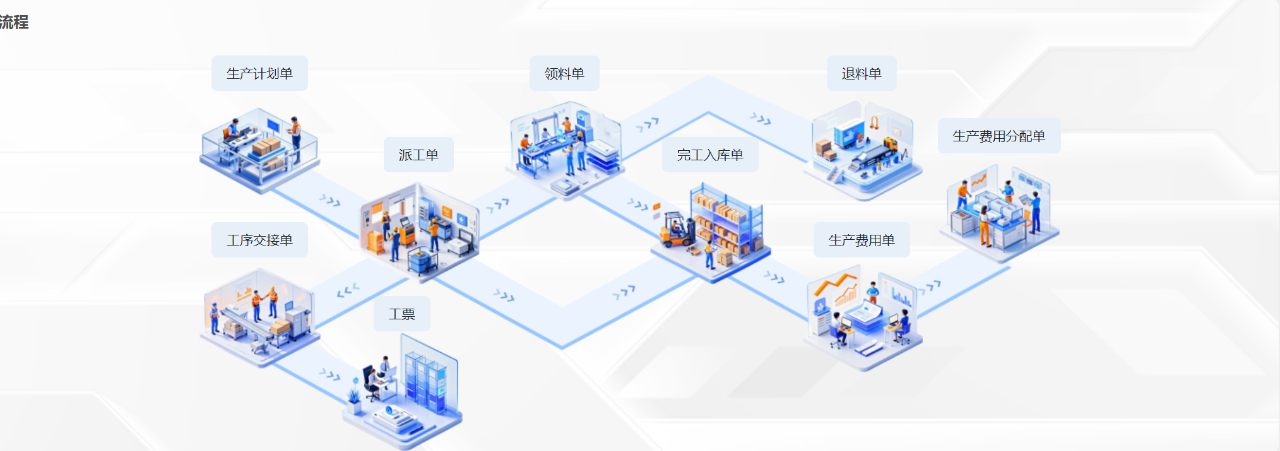 管家婆智造ERP可提供生产计划、生产派工、领料退料、工序工票、完工入库、费用分摊等流程信息化。