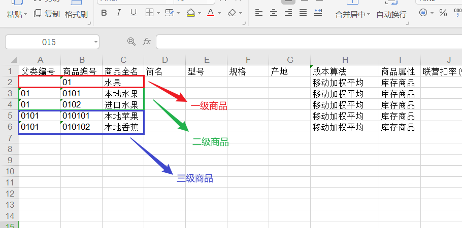 在大类商品编号为01,名称为水果,把水果进行分类,分为本地水果和进口水果,商品编号0101,商品名称为本地水果,和编号0102,商品名称进口水果。