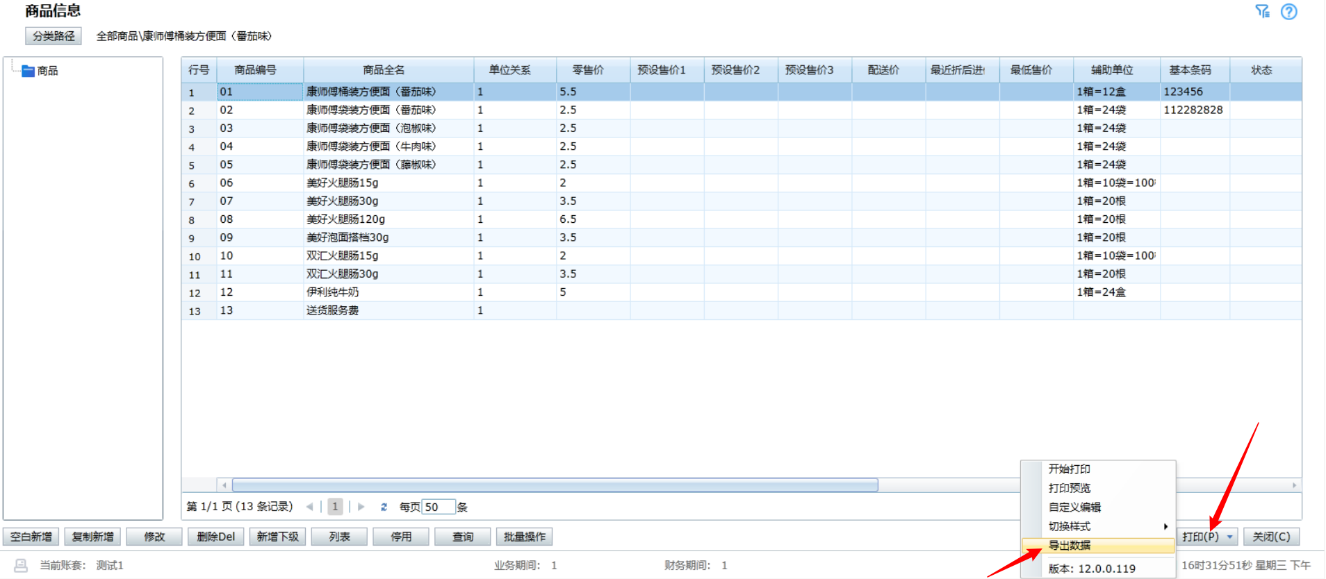 2、基本信息 > 打开商品信息 > 点击右下角打印 > 导出数据