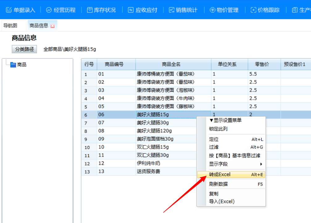 1、基本信息 > 打开商品信息 > 点击右键 > 转成Excel > 导出数据